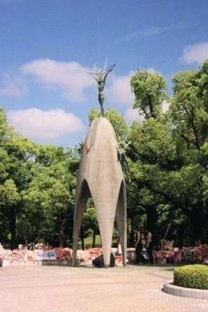 SADAKO SASAKI MEMORIAL IN HIROSHIMA, SURROUNDED BY PAPER CRANES.